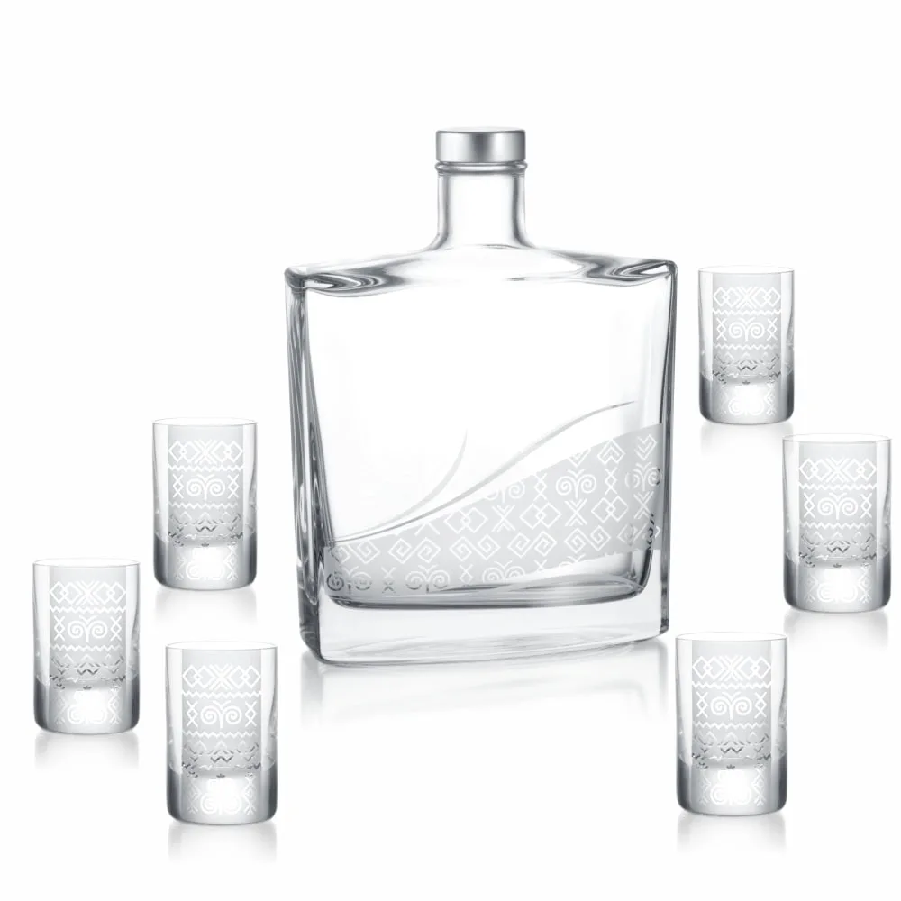 Naše kolekce Čičmany je složena z hranaté láhve na libovolný alkohol a ze šesti skleniček. Motiv zaručeně potěší nejen vyznavače folklóru. Dekorace je výsledkem kombinace řemeslného broušení skla s pískováním, skleničky jsou gravírovány. Zboží dodáváme v dárkovém obalu Brilant Crystal, který je vhodný pro přímé darování. Sklo je vyrobeno z bezolovnatého křišťálu, čímž šetříme naše životní prostředí. Dekorované výrobky nedoporučujeme mýt v myčkách. Gravírování je v ceně produktu.