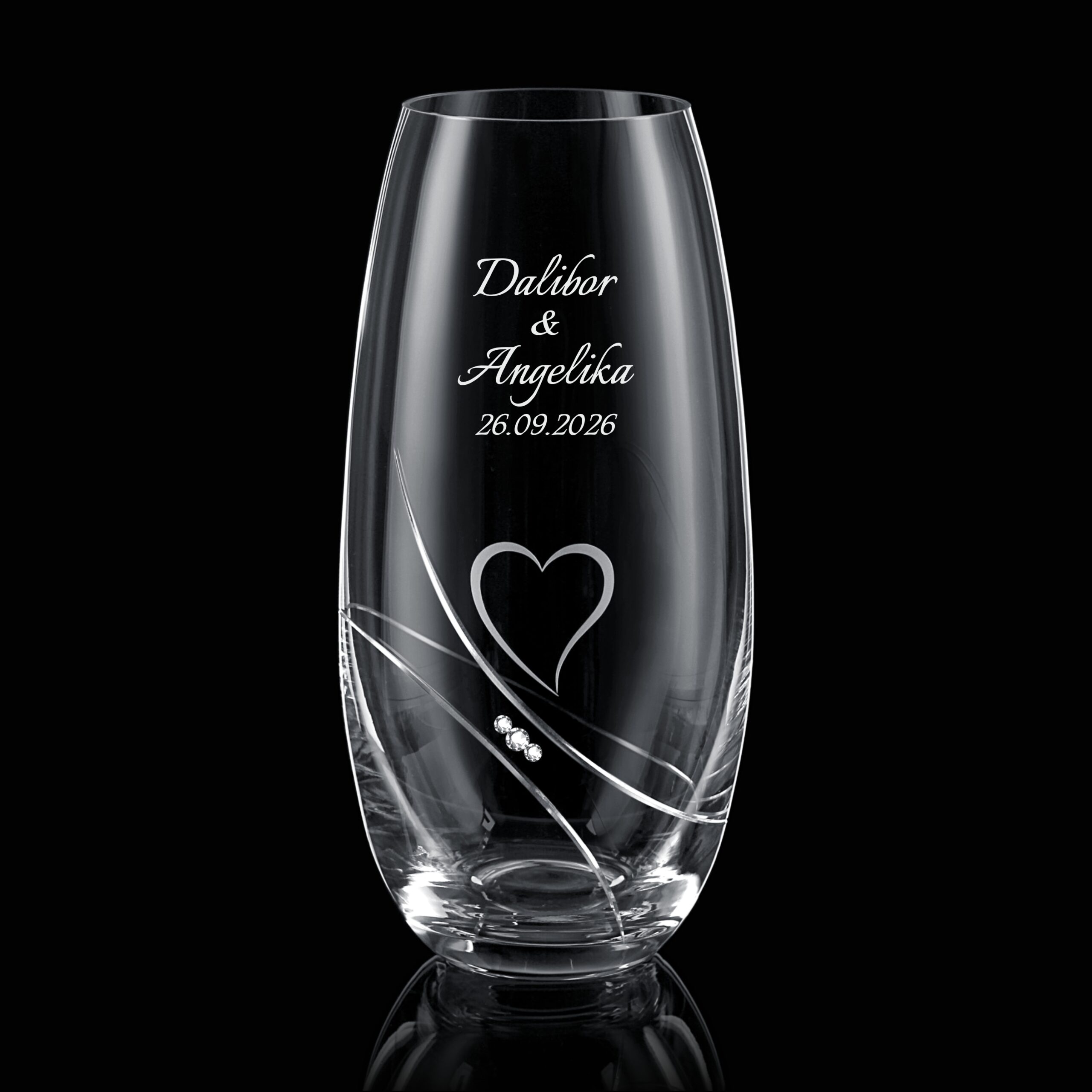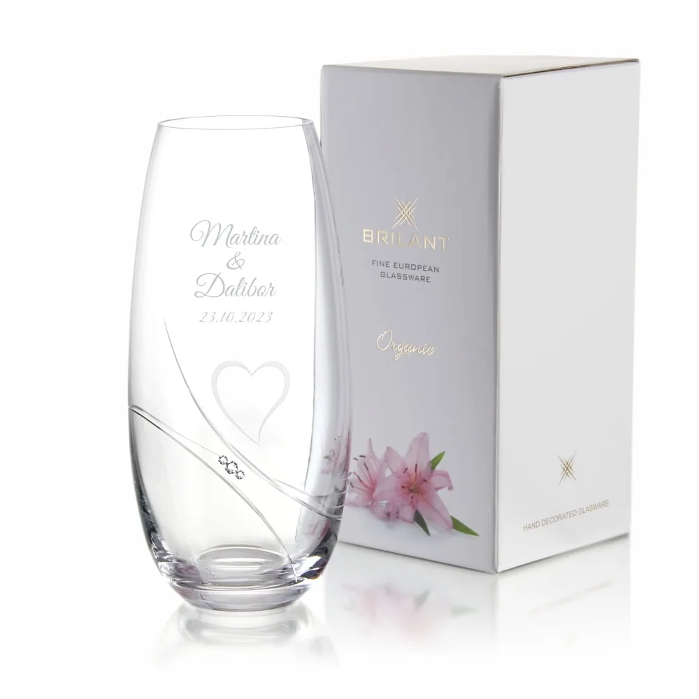 Oslavte lásku s krásnou řadou svatebních váz od firmy Brilant. Elegantní ručně broušená váza, ilustruje harmonii kombinací matných a leštěných řezů. Dekoračně vyvážená v celé linii, doplněná krystalky Swarovski. Vhodná na svatební kytici a díky libovolnému gravírování, i jako připomínka slavnostního okamžiku. Doporučuji mýt pouze ručně.
